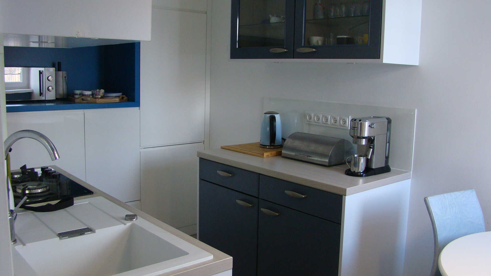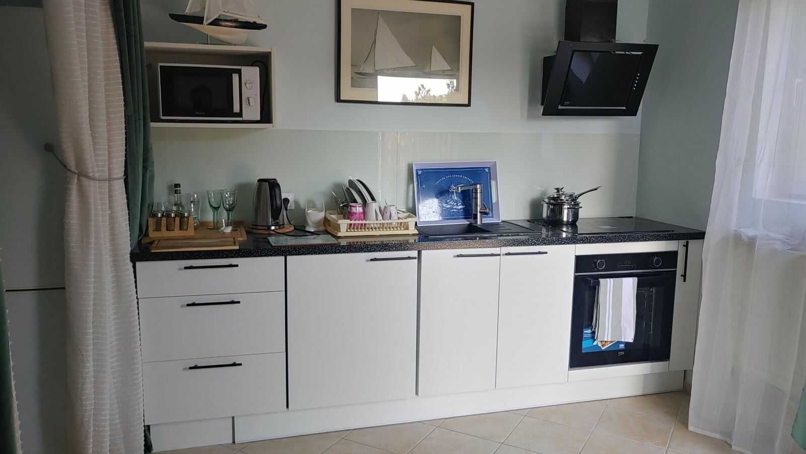 Wyposażenie kuchni: 4 palnikowa kuchnia indukcyjna z piekarnikiem, zlewozmywak, blat, sztućce, talerze, szklanki, czajnik elektryczny, mikrowela, lodówka, co pozwala na przygotowywanie posiłków na miejscu. Jest to szczególnie wygodne dla rodzin z dziećmi oraz osób preferujących własne posiłki.